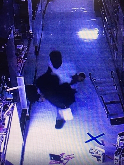 Surveillance video shows the suspect damaging several display cases, taking wigs, and cash. He was wearing a white t-shirt, dark head covering, and blue jeans.