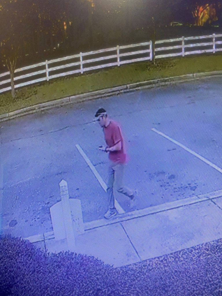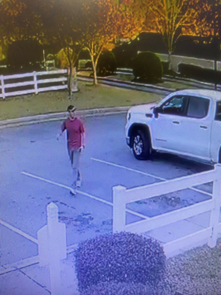 The suspect has dark hair and was wearing a red t-shirt, light colored sun visor hat and light brown pants.