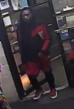 The suspect is a black male with a goatee style beard, last seen wearing a red, black, and white jogging suit with a hoodie, and black and white sneakers with red shoelaces.