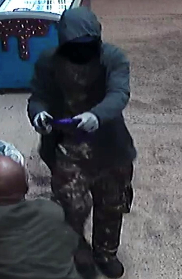 The suspect was last seen wearing a Gray hoodie, camouflage pants and top, gloves and a mask. (See photo below)